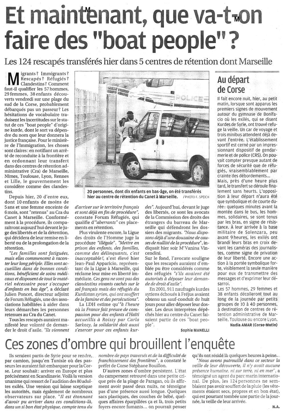 Cent vingt quatre Kurdes sont "naufragés" sur la cote sud de Corse. Vingt d’entre eux sont placés en centre de rétention. La Ligue des Droits de l’Homme, naturellement, crie au scandale. Quel avenir pour ces nouveaux "boat people" ?