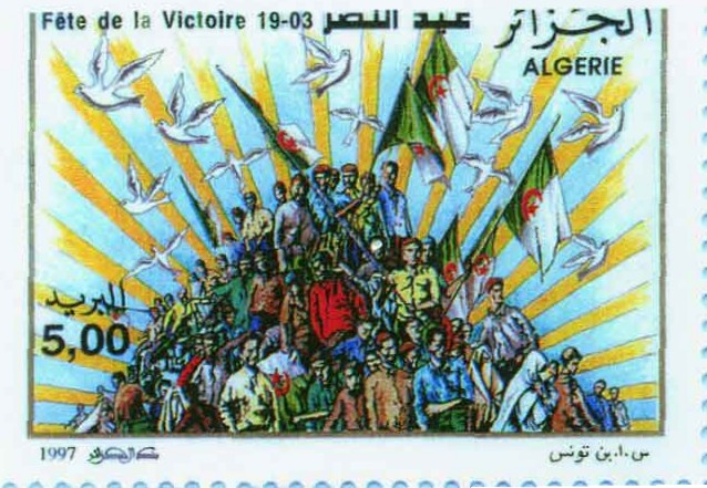 Ainsi, tout naturellement, la date du 19 mars, commémorée en Algérie comme celle de la « victoire » du FLN sur l’Armée française. ....ou la "vérité historique algérienne" que commémore la FNACA, comme l’illustre ci-dessus, le timbre célèbre de la poste algérienne édité au 35e anniversaire du cessez-le-feu), marque-t-elle aussi la victoire idéologique des Communistes français et de leurs alliés à l’issue de cette guerre. On comprend assez bien qu’ils tiennent à la « célébrer ».