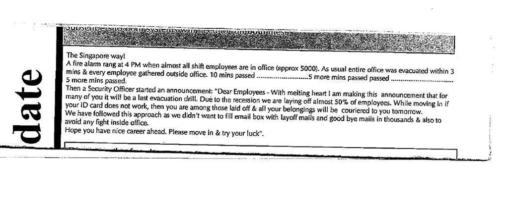 A cause de la crise, nous nous séparons d’environ la moitié des effectifs. En rentrant, si votre badge ne fonctionne pas, c’est que vous faites partie de cette moitié, et vos affaires vous serons renvoyées par courrier dès demain.