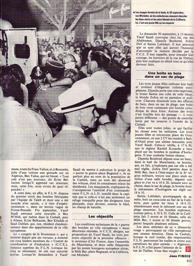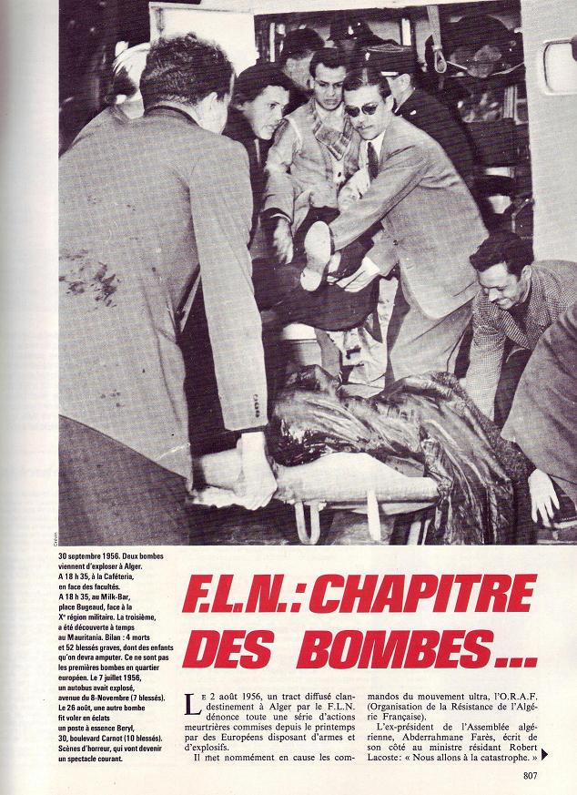 Les bombes ont été fabriquées dans les laboratoires clandestins du F.L.N par les experts communistes et livrées aux poseuses de bombes, Djamila Bouhired, Zohra Drif et Danièle Minne. Ces dernières se sont discrètement évaporées dans la nature après avoir laissé leur "cabas meurtrier" dans les deux établissements bondés en cette fin de dimanche après-midi, veille de rentrée scolaire.